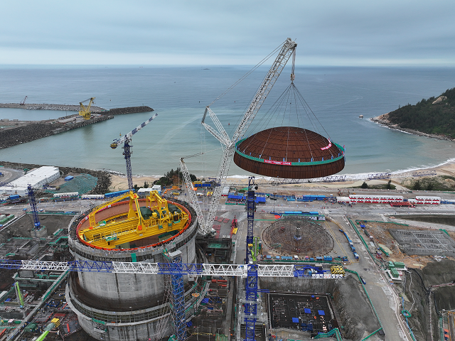 穹頂位于核島頂部,是保障反應(yīng)堆廠房完整性和密封性的重要組成部分。陸豐核電項(xiàng)目5號機(jī)組穹頂由預(yù)埋件、鋼板及焊接在外側(cè)的角鋼等部分構(gòu)成,重量達(dá)238.5噸,面積相當(dāng)于4個(gè)標(biāo)準(zhǔn)籃球場的大小,是核島鋼襯里施工中整體吊裝就位的最大鋼構(gòu)件。