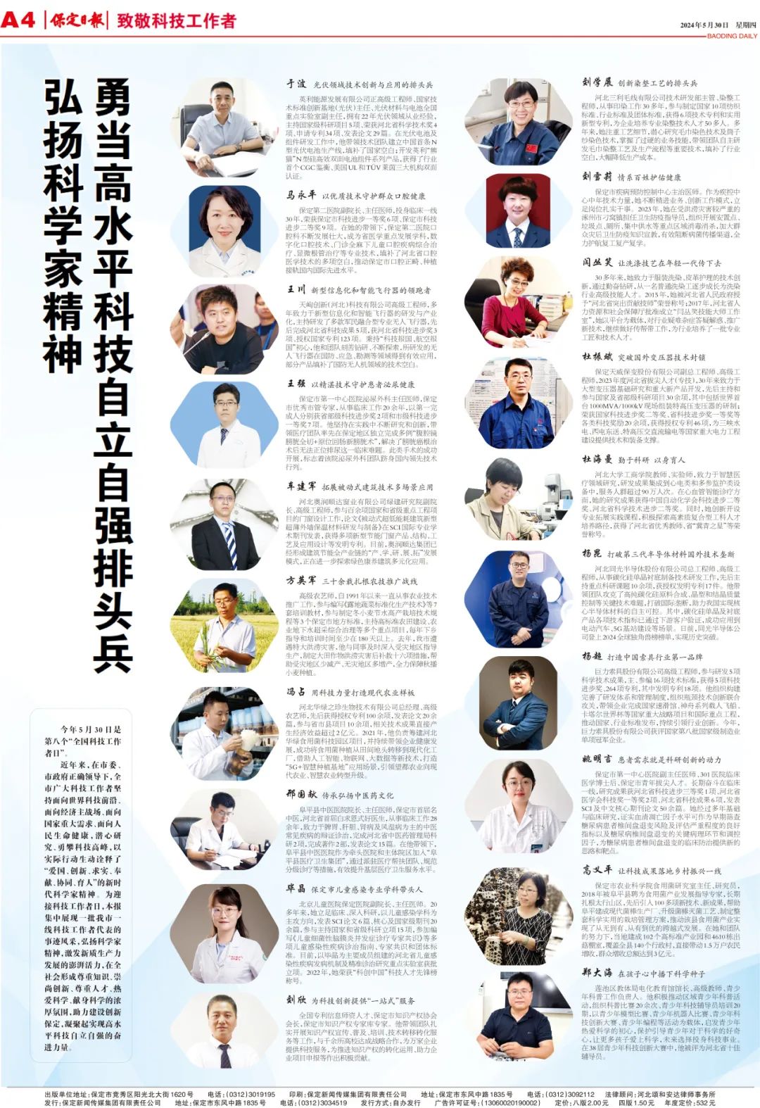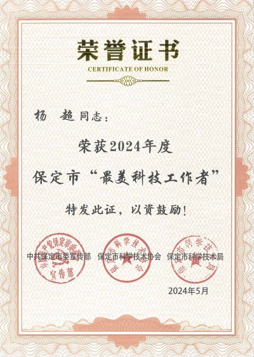 近日,保定市市委宣傳部、市科學技術(shù)協(xié)會、市科技局聯(lián)合開展了2024年保定市“全國科技工作者日”評選活動,經(jīng)組織推薦和評審專家委員會綜合評比、公示,巨力索具股份有限公司黨總支書記、總裁楊超榮獲“最美科技工作者”稱號。