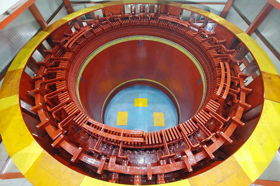 浙江天臺(tái)抽蓄電站是國(guó)內(nèi)在建單機(jī)容量最大、全球水頭最高的抽蓄電站,其2號(hào)機(jī)定子堪稱電站核心設(shè)備中的“巨無(wú)霸”。定子外徑約8.1米,由15萬(wàn)余張硅鋼片精密疊裝而成,整體起吊重量約482.7噸,是該電站開(kāi)工以來(lái)吊裝的第三臺(tái)具有毫米級(jí)定位精度的超大單體設(shè)備。