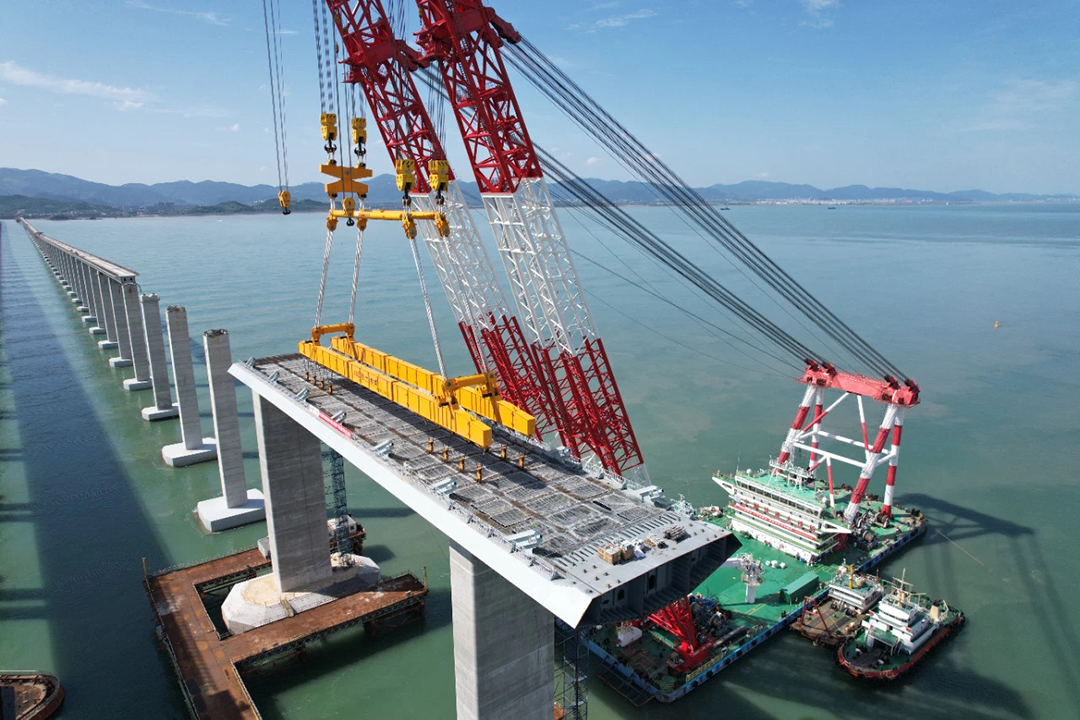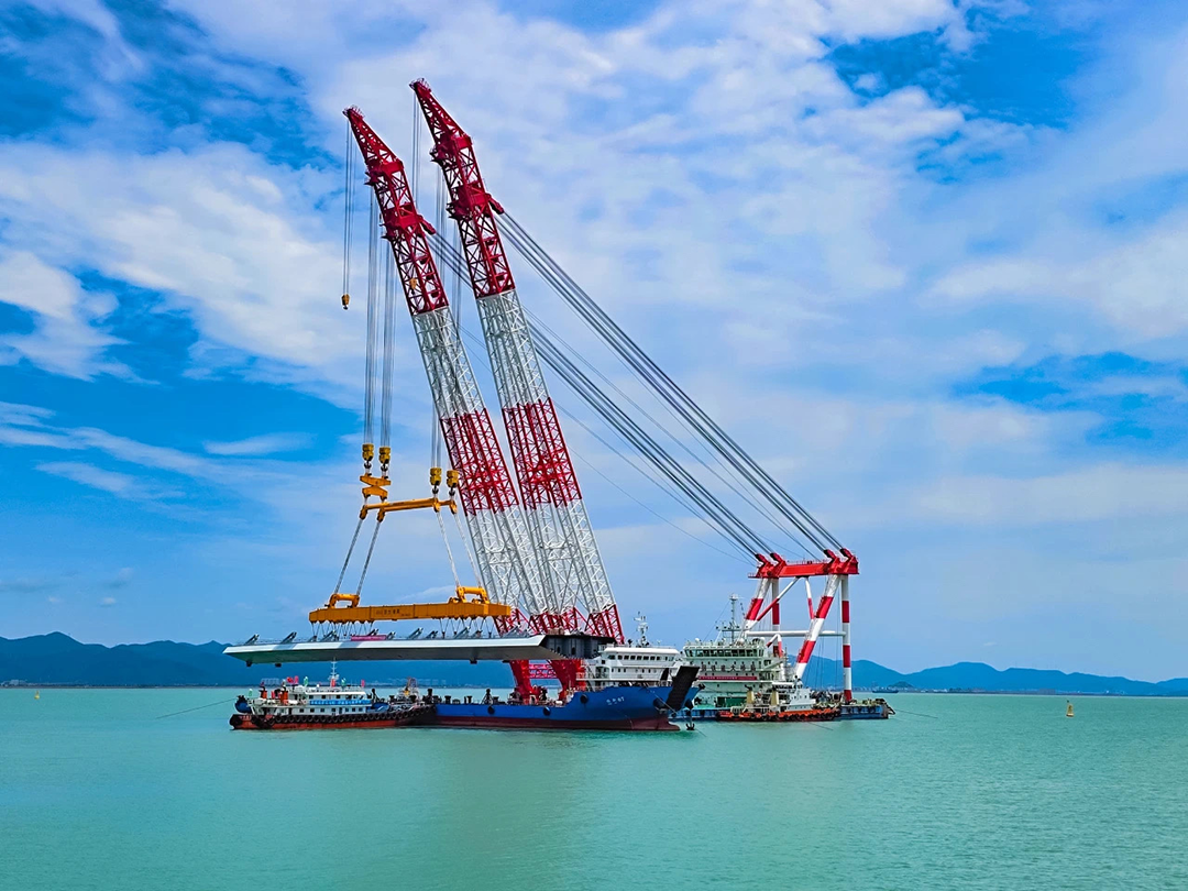 巨力索具針對復雜海況與空間限制,提供先進吊裝設備,研發定制化吊裝方案,與客戶單位通過三維建模模擬“鐵建大橋起1”號起重船吊裝路徑,動態調整船舶錨泊系統,將誤差控制在厘米級,配備吊運平衡系統與3D可視化動態監測系統,實時監控吊裝過程,同時制定了多套應急預案,確保鋼梁在強風、涌浪中穩定吊裝。這一系列技術突破,使“海上穿針”成為現實,為大橋主體結構施工奠定堅實基礎。