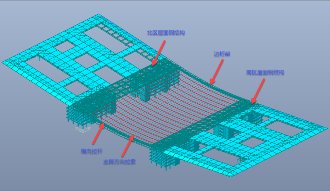 就拿高難度的拉索安裝來(lái)說(shuō),矢高約3.5米的超大弧形懸索鋼屋蓋,每榀桁架起吊后,需要找到最適宜的角度做成傾斜狀態(tài)。其中最長(zhǎng)的桁架,連續(xù)跨度可達(dá)120米左右。大屋面由“雙向鋼桁架+跨中拉索結(jié)構(gòu)”組成,中央?yún)^(qū)域110米全懸空的懸鏈態(tài)由兩側(cè)邊桁架及中間36根直徑為70毫米的不銹鋼拉索組成,施工牽引張拉、精度、溫度、雙索的扭曲偏轉(zhuǎn)是無(wú)可回避的難題。
