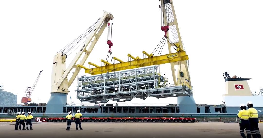 巨力索具主要負責該項目模塊的吊裝,分別提供了額定載荷為600T、300T、690T的吊框,吊裝能力為55T、75T、100T的卸扣及6種不同規格的無接頭繩圈,并提供專業吊裝方案,全程保障模塊吊裝的順利進行。