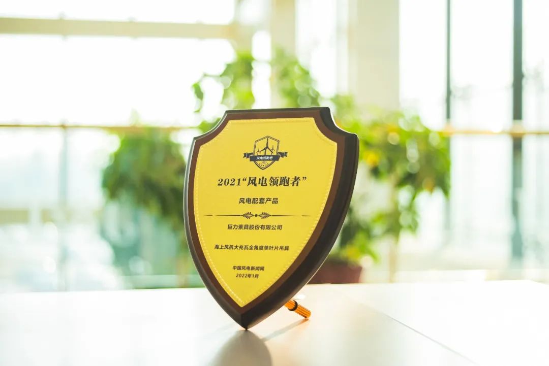2022年1月8日,由中國風電新聞網主辦的2021(首屆)“風電領跑者”技術創新論壇暨頒獎盛典在北京成功舉行。巨力索具憑借“國內首臺50噸大兆瓦全角度海上單葉片吊具”榮獲2021年度“風電領跑者”最佳服務產品榮譽稱號。